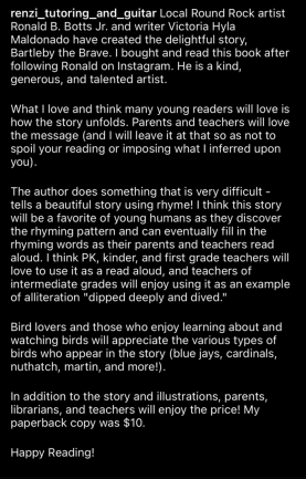 A 20+ Year Teacher Loves this Book! Artist Ronald B. Botts Jr. and writer Victoria Hyla Maldonado have created the delightful story of “Bartleby the Brave.” I bought and read this book after following Ronald on Instagram. He is a kind, generous, and talented artist. What I love and think many yound readers will love is how the story unfolds. Parents and teachers will love the message (and I will leave it at that so as not to spoil your reading or imposing what I inferred upon you). The author does something that is very difficult - tells a beautiful story using rhyme! I think this story will be a favorite of young humans as they discover the rhyming pattern and can eventually fill in the rhyming words as their parents and teachers read aloud. I think PK, kinder, and first-grade teachers will love to use it as a read-aloud, and teachers of intermediate grades will enjoy using it as an example of alliteration, “dipped deeply and dived.” Bird lovers and those who enjoy learning about and watching birds will appreciate the varioes types of birds who appear in the story (blue jays, cardinals, nuthatch, martin, and more!).